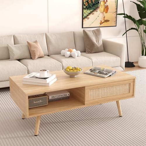 This chic coffee table brings a touch of elegance to any living room with its unique rattan woven design and solid wood legs. Measuring 41.3 inches in length, it is an ideal size for smaller spaces while still providing ample surface area for décor, drinks, or books. The sliding door storage is a fantastic feature, offering concealed space to keep your essentials organized and out of sight. The combination of MDF board and PE rattan ensures durability, enhancing both functionality and aesthetics in your home.