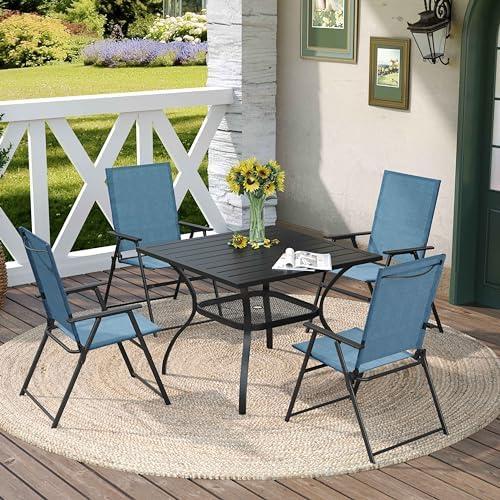 This stylish patio dining set is perfect for enhancing any outdoor space with its modern design. Featuring a sturdy black table measuring 36.8″ x 36.8″ x 28″ with an umbrella hole for shade on sunny days, it pairs beautifully with four vibrant blue portable folding chairs. Designed with versatility in mind, the chairs are easy to fold and store away when not in use, making this set ideal for lawns, gardens, and porches. The weather-resistant materials ensure that both the table and chairs can withstand various outdoor conditions, extending their durability and service life.