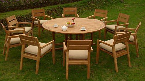 This outdoor dining set combines functionality and elegance, featuring a spacious 72″ round table accompanied by ten stacking arm chairs. Each chair is designed for comfort and convenience, measuring 23.75″ in width, 22.25″ in depth, and 35″ in height. The table includes a 2″ umbrella hole for added shade during hot sunny days, which can be conveniently covered with a removable wooden cap when not in use. Made with premium A-grade teak, this furniture set promises durability and weather resistance, ensuring it remains a staple in your outdoor area for years. The use of stainless steel accents not only complements the teak but enhances its overall aesthetics, while traditional mortise-and-tenon joinery ensures stability and strength in each piece.