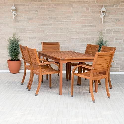 This dining set includes a rectangular table and six comfortable armchairs, designed to seamlessly blend with both indoor and outdoor environments. The table measures 59L x 35W x 29H, providing ample space for dining with family and friends. The armchairs, with dimensions of 23L x 23W x 36H and seat dimensions of 19L x 22W x 19H, are not only aesthetically pleasing but also functional, featuring a stackable and lightweight design for easy storage. Additionally, the table is equipped with a 2-inch umbrella hole, making it perfect for sunny days.
