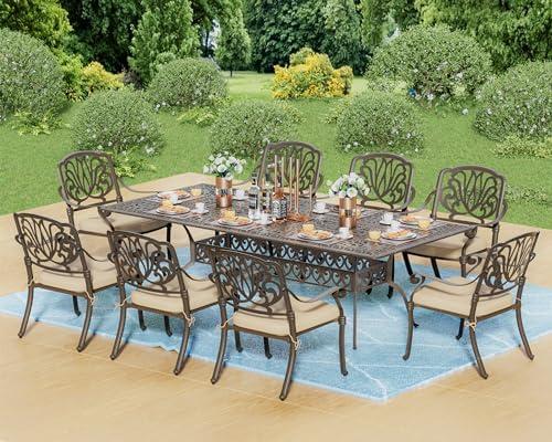 This elegant outdoor dining set is crafted from durable cast aluminum, ensuring it withstands various weather conditions while maintaining a stylish look. The rectangular table, measuring 86.6″ in length, can comfortably accommodate 8 to 10 people, making it perfect for hosting gatherings or family meals. Each chair features ergonomic designs with high backrests and well-ventilated seating, complemented by soft, khaki cushions that provide extra comfort during long meals. The presence of an umbrella hole in the center of the table allows for shade, enhancing your outdoor experience.