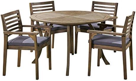 Crafted to enhance any backyard or patio, this dining set features a stunning round table framed with durable acacia wood and elegant Y-shaped concave legs. The charming wooden slats and modern gray finish make this piece a delightful focal point for any outdoor setting. Accompanied by four comfortable seating options, each equipped with dark gray, water-resistant cushions, this collection is ideal for enjoying meals or leisurely gatherings in the fresh air. Measuring 47.25 inches in diameter and 30 inches in height, the table’s proportional design ensures ample seating space while maintaining a cozy atmosphere.