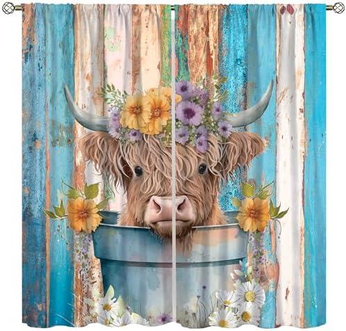 Cute Highland Cow Curtains, Vintage Rustic Farmhouse Wood Panels Fun Cow in A Bucket Design