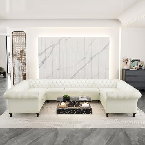 This stylish and spacious sectional sofa seamlessly blends comfort with sophistication, making it an excellent choice for various settings, from living rooms to offices. With its deep button tufting and rolled armrests, the design is both modern and timeless, providing a chic aesthetic for any decor. Its U-shaped configuration accommodates up to nine people, making it ideal for family gatherings or entertaining guests. Constructed with high-density sponge cushions wrapped in durable artificial leather, the sofa promises an inviting seating experience for extended periods. Furthermore, birch wood legs provide sturdy support while protecting floors with non-slip feet.