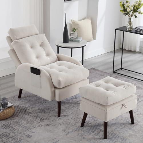 The stylish chair and ottoman duo offers a combination of comfort and practicality for various scenarios, including living rooms, bedrooms, and reading nooks. The soft velvet upholstery not only enhances the aesthetic appeal but also provides a soothing touch, making it an inviting spot to unwind after a long day. With a three-stage adjustable backrest, this set allows users to select their desired angle—ranging from 110° to 180°—making it ideal for activities such as reading, watching TV, or simply relaxing. The ottoman doubles as both a footrest and a side table, with ample storage space to keep essential items like books and remotes neatly tucked away.