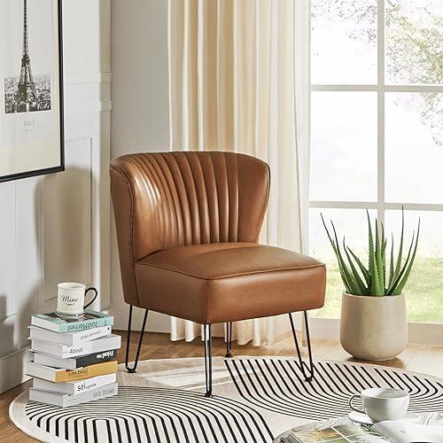 HULALA HOME Faux Leather Accent Chair with ‌Metal Base, Mid Century Modern Living Room Chair, Comfy Upholstered⁣ Armless Side⁢ Chair for Bedroom Office, Camel