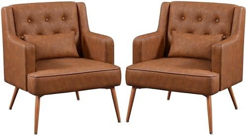 Yaheetech Accent Chair, Living Room⁢ Chair Mid Century PU Leather Armchair Lumbar Pillow, Comfy Upholstered Reading‌ Chair Wood Leg Bedroom Brown 2PCS