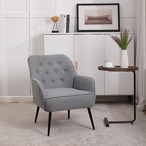 Goujxcy Modern Mid Century Living Room Chair Barrel Chair Linen⁢ Button-Tufted Upholstered Accent Armchair with Black ​Metal Legs for Living Room Bedroom Home Office, ⁣Tufted Back Club Chair (Light Grey)