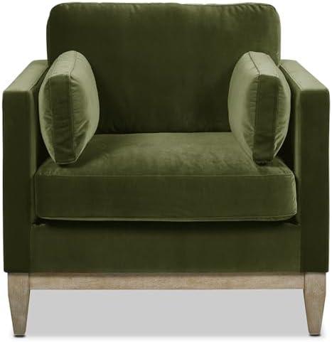 This accent arm chair is designed with a contemporary farmhouse aesthetic that complements any living space. Upholstered in performance polyester velvet, it offers a luxurious yet resilient medium seat feel thanks to its premium feather-down wrapped high-density triple-layer foam. The durable fabric boasts a 30,000 double rub count, ensuring longevity in high-traffic areas. Its solid birchwood frame not only adds to the chair’s elegance but also ensures stability and support, with a weight capacity of 300 lbs. Adding convenience to style, the chair features removable and reversible back and arm cushions, simplifying maintenance and allowing for versatile looks.
