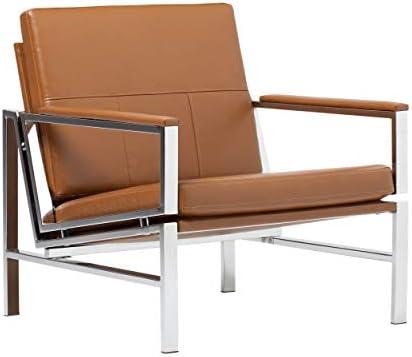 This accent chair features a striking architectural design that lends a contemporary feel to any space, whether at home or in an office setting. Crafted from durable bonded leather in an eye-catching caramel brown hue, it highlights clean lines and mid-century style while ensuring comfort with its padded armrests and extra-deep seating surface. The sleek chrome legs not only provide stability but also add a touch of glamour, making it a perfect addition to your living room or guest area.