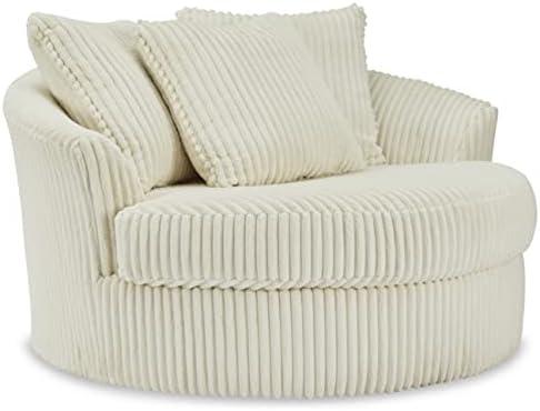 This accent chair embodies a plush and posh aesthetic with its luxurious cord upholstery in a stunning ivory hue, making it an attention-grabbing addition to contemporary living spaces. Measuring 58” W x 55” D x 36” H, this oversized chair offers generous space to sink into, featuring high-density foam cushions and polyester fabric that promise comfort. The design supports a cozy atmosphere while enhancing your room’s charm. With 360-degree swivel functionality and included matching throw pillows, it’s positioned as a perfect spot for relaxation and socializing.