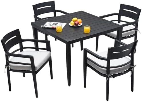 This outdoor dining set is an excellent choice for those looking to enhance their backyard or patio experience. Constructed with a sturdy ember black powder-coated steel frame, this set offers both durability and weather resistance. The square table, designed with a convenient umbrella hole, measures 40″ x 40″ x 28.7″, ensuring enough space for outdoor meals with family or friends. The set includes four dining chairs featuring thicker cushions made of 2.4″ high-density sponge, providing both comfort and support. The ergonomic design of the chairs promotes relaxation, making it ideal for leisurely breakfasts, brunches, or afternoon teas outdoors.