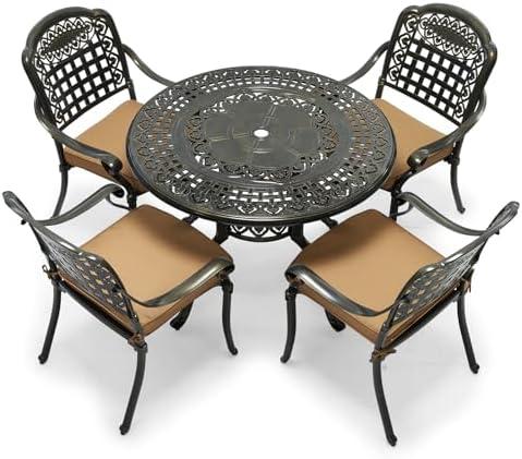 This outdoor dining set combines comfort and durability, featuring four cushioned chairs and a round table that has an umbrella hole for added convenience. The cast aluminum construction ensures that the set is both rust-resistant and weather-resistant, offering long-lasting use in various outdoor conditions. The elegant lattice-weave design, complemented by decorative floral patterns, adds a sophisticated touch. With dimensions that comfortably accommodate meals and gatherings, the set is perfect for your patio, garden, or backyard. Additionally, the stackable chairs make for easy storage when not in use, and the adjustable table feet provide stability on uneven surfaces.