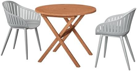 Enjoy outdoor dining with a classy 3-piece set consisting of two durable chairs and a stylish round table made of solid eucalyptus wood. The modern design enhances any patio or backyard space, bringing indoor coziness outside. With dimensions of 35L x 35W x 29H for the table and 21.5L x 21.5W x 31.5H for the armchairs, this combination offers ample space for gatherings. The chair seat dimensions of 15L x 14W x 15.8H ensure comfort while you enjoy meals with family and friends. Made from high-quality Duresin and reinforced with durable aluminum legs, this set promises longevity and low maintenance.