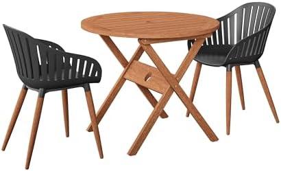 This outdoor dining set features solid eucalyptus wood, providing excellent durability and resistance to various weather conditions. With dimensions of 35L x 35W x 29H for the table and 21.5L x 21.5W x 31.5H for the chairs, it is designed for comfort and style. The lightweight yet sturdy build allows for easy rearrangement, while the sleek Duresin chairs, manufactured from high-quality recyclable materials, add a modern touch. This combination is perfect for creating a cozy and inviting atmosphere in your patio or backyard space.