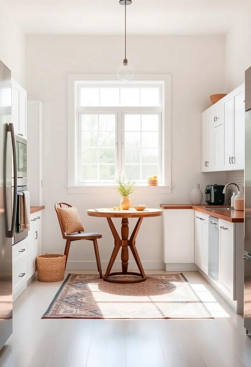 To create a multifunctional area in your small kitchen, it’s essential to maximize every inch of space while maintaining a warm and inviting atmosphere. Start by selecting furniture that serves dual purposes; for example, a small, round table can double as a workspace or a dining area. Incorporate seating options that offer storage beneath, such as benches or ottomans, allowing you to stow away items like tableware or linens. Accessorizing with soft cushions and throws can make the area feel cozier while still being practical for work or meals.