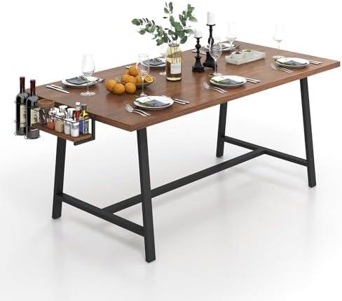 This spacious dining table measures 72” x 36.5” and comfortably accommodates 5-7 people, making it an ideal centerpiece for family gatherings or dinner parties. The design incorporates two wine racks and a spice rack, effectively enhancing organization and accessibility for your kitchen or dining room essentials. Crafted with a robust metal frame, this wooden tabletop can support up to 330 lbs, ensuring durability for years to come. Its stylish walnut finish combined with a matte black metal frame creates a rustic farmhouse charm, making it versatile enough for various interior settings, including studies and home offices.