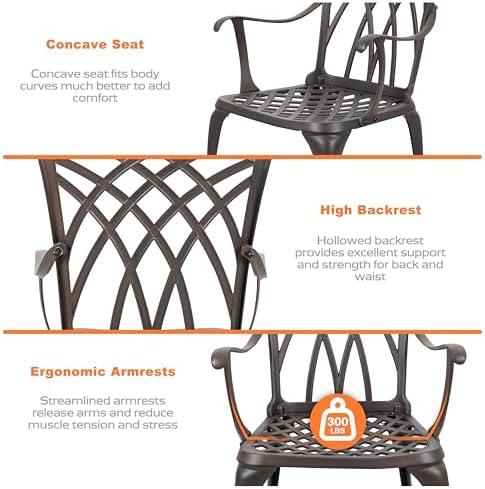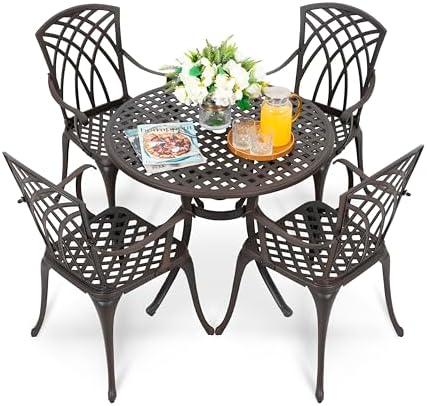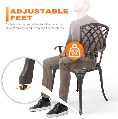 When we consider the aesthetic appeal of this outdoor dining set, the stylish design immediately catches our eye. The retro brown powder coating, adorned with delicate gold speckles, transforms the cast aluminum structure into a chic centerpiece for any patio or garden. Its curved armrests and hollow backrest not only enhance the visual aspect but also ensure an ergonomic fit that invites long, leisurely meals enjoyed under the open sky. The round dining table, with a diameter of 33.46 inches, provides a spacious surface that can comfortably accommodate drinks and snacks for gatherings, establishing a welcoming atmosphere for friends and family.