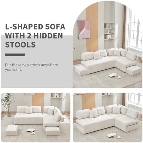 We recently had the opportunity to incorporate the sectional sofa into our living space, and our experience has been overwhelmingly positive. The design stands out with its space-saving features, particularly the two hidden stools that fit seamlessly underneath. They are easily accessible for additional seating during gatherings, and once the event is over, stowing them away is a breeze. This thoughtful addition ensures our living area remains organized while providing flexibility for unexpected guests. The overall dimensions fit comfortably in our room, while the soft chenille fabric adds a touch of elegance and luxury.