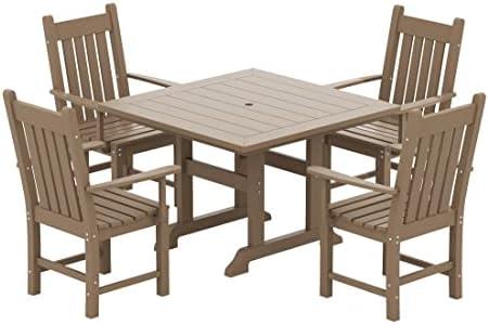 Transform your outdoor space into a cozy dining area with this stylish five-piece seating arrangement. The square table, measuring 43 inches, is designed to accommodate up to four guests, offering ample legroom for ultimate comfort. Made from durable HDPE material, this set can withstand weather elements while mimicking the beautiful aesthetics of natural wood without the drawbacks of splintering, cracking, or peeling. The semi-gloss finish lends a touch of elegance and makes it a perfect fit for various outdoor settings, from gardens to poolside gatherings. The slatted design enhances the rustic, farmhouse-inspired look while ensuring water naturally drains away, keeping your furniture in pristine condition.