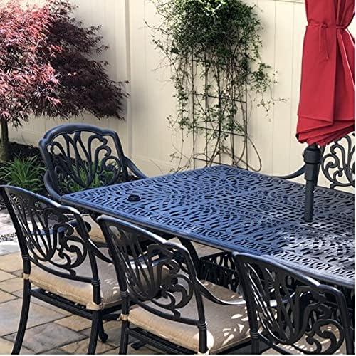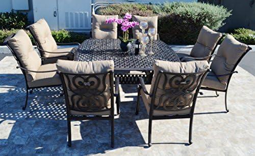 This outdoor dining set features a spacious rectangular table measuring 44″ x 84″, perfectly accommodating gatherings with friends and family. It includes eight stackable dining chairs, each designed with dimensions of 25″ W x 22″ D x 36″ H. The chairs offer comfortable seating, thanks to the Sunbrella linen sesame cushions, which add both style and durability to the ensemble. Made from cast aluminum with a powder-coated finish, this set promises resistance against rust and weather elements, ensuring longevity. A five-year warranty backs the product, underscoring its quality and manufacturer confidence.