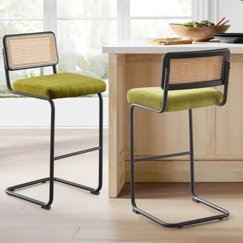 Crafted from high-quality materials, these bar stools feature a unique combination of comfort and style. With a padded seat made from premium velvet fabric that feels smooth to the touch, these chairs offer an inviting space for dining or entertaining. The integrated high-elastic sponge filling ensures long-lasting comfort, while the breathable hand-woven rattan backrest adds an aesthetic appeal. The sturdy cantilevered base design can support up to 300 lbs, providing flexibility and stability. Additionally, built-in footrests and protective plastic glides help to maintain your floors, making these stools a perfect choice for your kitchen island or entertainment area.