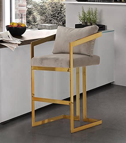 This exquisite bar stool boasts a taupe velvet upholstery that not only enhances aesthetic appeal but also adds a plush texture that elevates any modern or contemporary space. The architectural goldtone solid metal frame provides a robust yet sleek foundation, ensuring long-lasting durability while delivering a bold statement piece for your decor. With dimensions of 19.5″ width, 21.5″ depth, and 41″ height (seat height: 26″), it fits snugly into various bar or counter setups. The slope arm design coupled with a mid-back for support and an elegantly designed footrest creates a captivating balance between functionality and style.