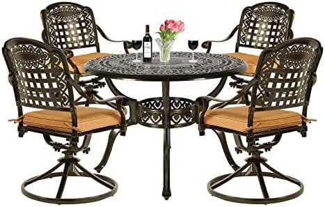This outdoor dining set combines charming design and durable materials, making it an ideal addition to your patio or garden space. Constructed from rust-resistant cast aluminum, it features a sophisticated round table with a lattice-weave pattern that enhances the aesthetic appeal of your outdoor setting. The set includes four swivel chairs designed for comfort and convenience, allowing guests to easily turn and engage in conversation without the hassle of moving the chairs. Moreover, the inclusion of an umbrella hole enables you to stay cool on sunny days, elevating your outdoor dining experience.