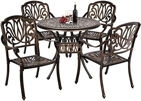 This outdoor dining furniture set is crafted from cast aluminum, known for its weather resistance and durability. The beautifully designed table and four chairs feature an antique bronze finish complemented by a lovely lattice-weave pattern, making it a stylish addition to any garden, patio, or balcony. Each chair is equipped with a high-backrest and comfortable cushions, designed for ergonomics and support. The set is also designed for convenience, featuring a 2-inch umbrella hole in the table for those sunny days, and can be easily cleaned with a damp cloth.