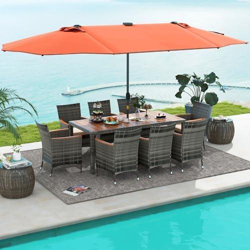 Transform your outdoor spaces into a cozy retreat with this elegant dining set. Featuring eight ergonomically designed, stackable rattan chairs and a spacious acacia wood dining table, the suite promises comfort and durability. The standout element is the grand 15ft double-sided patio umbrella, which not only offers extensive shade but is also equipped with solar-powered lights that create a warm ambiance for evening gatherings. The umbrella’s user-friendly hand-crank mechanism facilitates easy adjustment according to the sun’s position, making it a functional addition to your patio. The combination of fade-resistant PE rattan and solid wood provides both aesthetic appeal and long-lasting utility.