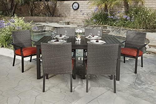 This outdoor dining furniture set provides both style and functionality, perfect for hosting gatherings in your backyard or on your porch. The six chairs come equipped with 2.5″ thick cushions made of water-resistant polyester, ensuring comfort that lasts through long meals or conversations. Constructed with high-quality PE wicker and a heavy-duty steel frame, this furniture is designed to withstand the elements, making it weather-resistant. The oversized dining table, measuring 63″L x 36.7″W x 28.7″H, features a textured surface that’s safer than traditional glass tops and includes a 1.5″ umbrella hole for adding shade on sunny days. With adjustable feet, the table can adapt to uneven ground, providing stability wherever you choose to set it up.