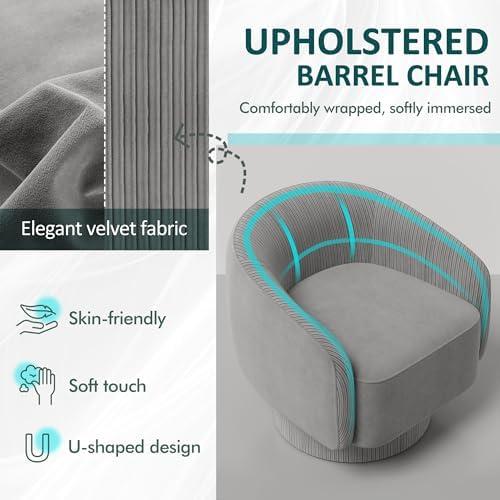 - Comfortable Design: The plush velvet upholstery and curved armrests give our swivel barrel chair a cozy, inviting feel, making it a perfect spot to unwind after a long day.