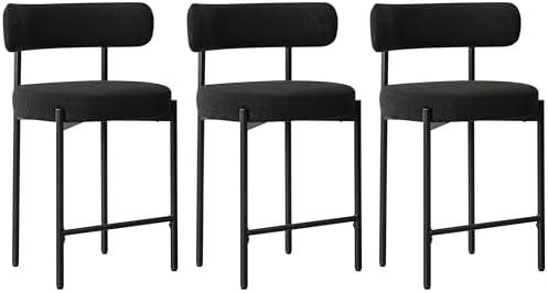 These counter stools bring a blend of modern design and exceptional comfort to your kitchen or dining area. With soft bouclé upholstery and a sturdy black powder-coated metal frame, they are both visually appealing and durable. The stools feature reinforced backrests and high-density foam cushioning, providing comfort during long meals or gatherings. With a seat height of 24 inches, they fit perfectly under counters measuring 33 to 36 inches high, making them an ideal choice for kitchen islands. The minimalist design, characterized by rounded seats and a curved back silhouette, adds a sophisticated touch to your decor.