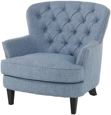 This club chair showcases a soft fabric that not only enhances comfort but also elevates the aesthetic of your living space. Its tufted back provides a touch of elegance, while the studded perimeter adds a hint of sophistication. Designed to fit seamlessly into various decors, its versatile light blue hue brings a refreshing pop of color to any room. With dimensions of 34.3″ L x 33.5″ W x 29.5″ H and a weight of about 41.9 pounds, it’s both visually appealing and sturdy enough for everyday use.