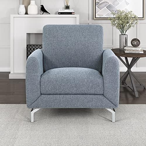 This chair brings a touch of modern elegance to any living room setting. It features a blue textured fabric that covers a sturdy wooden frame, complemented by sleek silver metal legs that add visual appeal. The foam boxed pocket coil cushion ensures comfort while maintaining style, making it a great focal point for your space. The design is perfect for those who appreciate a contemporary aesthetic, and the attached cushion provides a cozy seating experience for you and your guests.