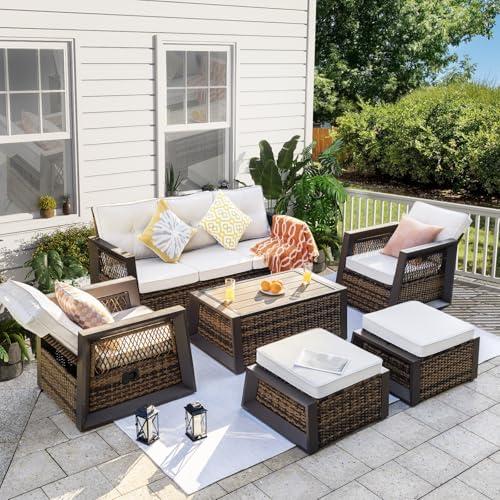 Pros of this outdoor furniture set include robust construction for weather resistance, amplified comfort due to its thick cushions and spacious design, and versatility with various placement options in gardens or backyards. However, some cons to consider are the need for initial cushion fluffing after unpacking, and that assembly may be required, which could take time and patience. it stands out for its appealing style and solid comfort, elevating any outdoor living area.
