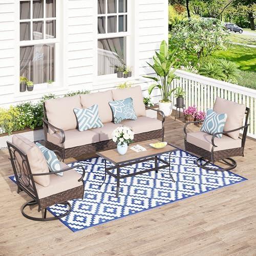 This patio furniture set is designed for comfort and durability, featuring a heavy-duty metal structure and a unique coating that protects against wind and rain. The ergonomic design, including extra wide seats, high backrests, and 5.5-inch thick cushions, enhances relaxation while reducing pressure points during extended sitting. The set includes a 3-seat sofa, two swivel chairs, and a coffee table, making it an ideal choice for gatherings or quiet moments outdoors. Its modern aesthetic blends well with any patio design, providing not just functionality but also an attractive focal point for your outdoor space.