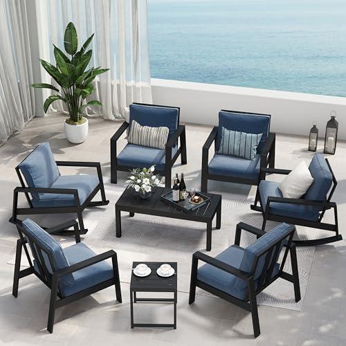 This elegant outdoor furniture arrangement is designed for comfort and durability, featuring a robust aluminum frame that is resistant to rust and corrosion. The thick high-density foam cushions enhance relaxation, ensuring that the seating experience remains inviting without compromising aesthetic appeal. Perfectly suited for various outdoor spaces, this set includes four armchairs, two oversized rocking chairs, a spacious coffee table, and a side table, making it an excellent choice for gatherings with family and friends. The coffee table boasts a generous surface area of 45”W x 22”D, providing ample space for snacks, drinks, and décor, and the water-resistant cushion covers protect against spills and moisture.