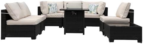 This outdoor sectional set combines elegance with functionality, featuring a sturdy steel frame that resists rust and weather changes. The all-weather wicker is made to endure various climatic conditions, while the thick, waterproof cushions provide comfort and easy maintenance. Included in the set are four armless chairs, two corner chairs, a coffee table, and a 28″ gas fire pit table. The fire pit features a dual-tube stainless steel burner with a substantial heat output of 55,000 BTU, ensuring a warm ambiance for gatherings. It is equipped with glass beads for consistent heating and comes with windshields to keep the flames contained.