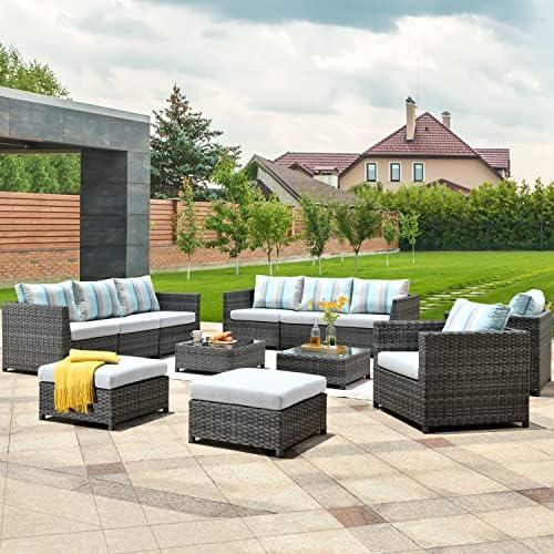 This outdoor sectional sofa set features a robust aluminum frame and is designed with weather-resistant PE wicker, ensuring durability and comfort throughout the seasons. The Sunbrella fabric cushion covers are not only attractive but also practical, offering water and UV resistance that prevents color fading. Each piece is pre-assembled for your convenience, allowing you to enjoy your new outdoor seating area without the hassle of assembly. The contemporary design includes multiple seating options and two tempered glass top coffee tables, making it ideal for gatherings of 8 to 10 people.