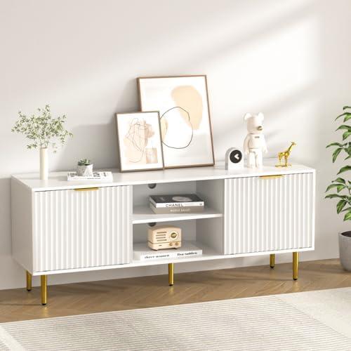 This modern television console exudes a retro elegance that enhances any living space. It accommodates TVs up to 65 inches and features a wide desktop, open shelves, and two cabinets with individual doors for discreet storage. The adjustable middle shelf provides flexibility for various items, while two cable management holes help keep cords organized and out of sight. Designed with six metal legs, this stand ensures stability and adds a contemporary touch without taking up much floor space, making it suitable for both bedrooms and living rooms.