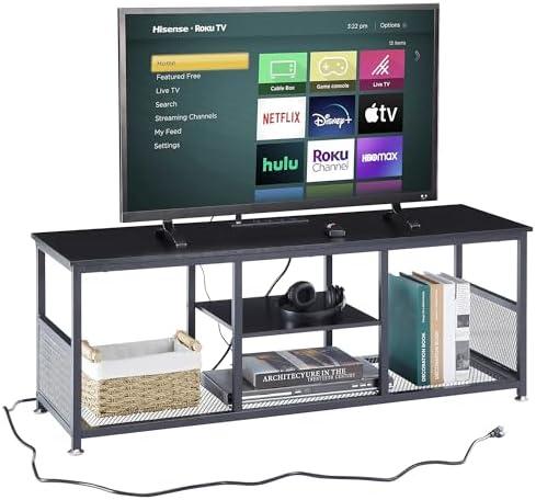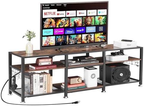 This entertainment center features a built-in power strip providing four outlets and two USB ports, making it exceptionally convenient for powering multiple devices like TVs, gaming consoles, and sound systems. The robust structure, crafted from high-quality MDF and a metal frame, ensures maximum durability and stability, with the tabletop supporting up to 180 lbs. Its three open shelves offer ample space for displaying media essentials, while the wire mesh design helps with heat dissipation. Additionally, it includes thoughtfully placed S-shaped hooks for hanging accessories, and adjustable feet that accommodate uneven floors.