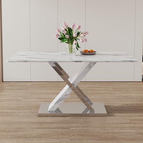 This elegantly designed dining table features a faux marble top supported by a unique X-shaped stainless steel base, combining both style and durability. Measuring 63 inches in length, 37 inches in width, and 30 inches in height, it comfortably accommodates 4-6 people, making it ideal for family gatherings or dinner parties. With a water-resistant and scratch-resistant surface, the table is easy to maintain and versatile enough for various uses, allowing it to function as a dining table, conference table, or even an executive desk. The modern minimalist design enhances any dining room decor and creates a sleek look in your space.