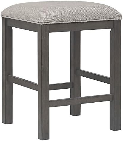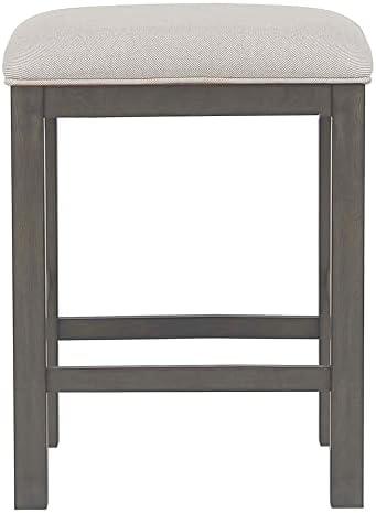 We appreciate the contemporary appeal of this backless counter height stool, which effortlessly merges comfort with style. Its upholstered seat features a soft, neutral white and tan woven fabric, providing a designer touch that complements a variety of decors. The distressed gray finish on the wood frame, combined with subtle hues of light and dark oak, creates a warm and inviting aesthetic that seamlessly integrates into both rustic and modern settings. This versatility allows us to mix and match it with other furnishings, whether they are from the industrial, beach house, or traditional styles.