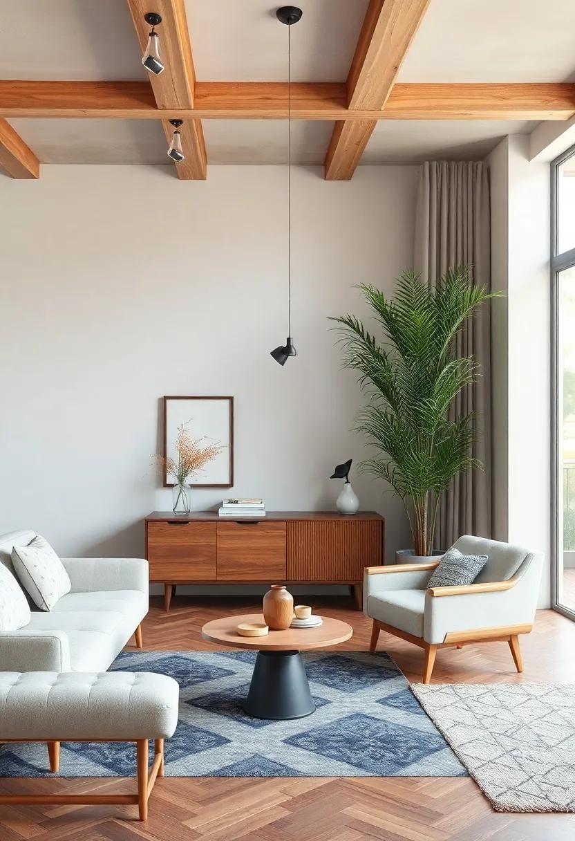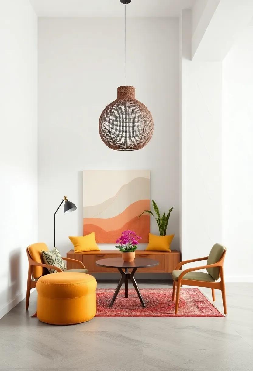 • Mid-century furniture paired with sleek, modern lighting fixtures for a dynamic look.