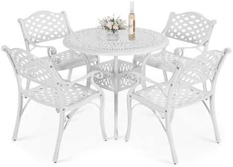 This charming outdoor dining set features a sturdy cast aluminum construction, promising years of use without worrying about rust or weather wear. The 35.4″ round table comes with a convenient umbrella hole, allowing you to enjoy meals outdoors regardless of the sun or rain. The elegant hollowed design and classic lattice pattern of both the table and chairs add a sophisticated touch, making it a pleasing addition to any patio, garden, or balcony. Additionally, the surface is smooth and waterproof, ensuring easy cleaning and maintenance after gatherings with friends and family. The adjustable foot pads further enhance stability on uneven ground, ensuring you can dine comfortably.