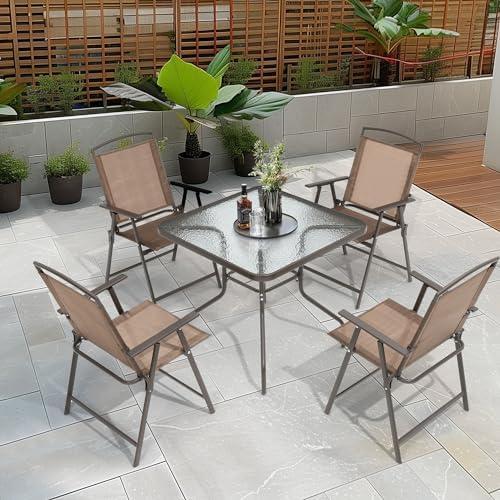 Experience a perfect blend of style and functionality with this outdoor dining set featuring a square glass table and four folding chairs. Designed with a rust-resistant coating, it promises durability while maintaining a chic aesthetic. The tempered glass top adds an elegant touch, complemented by the breathable Textilene fabric of the chairs, which not only ensures comfort but also resists deformation over time. An innovative design includes a built-in umbrella hole, accommodating most standard umbrellas for those sunny days, while the easy assembly required for the table makes setup a breeze.