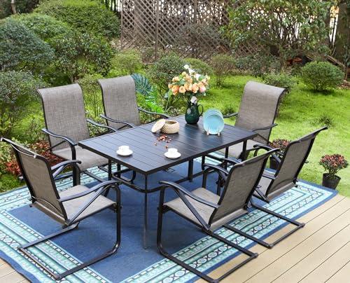 This outdoor dining set combines a spacious dining table and six C spring motion chairs, offering an ideal solution for family gatherings or relaxed dinners. The large table, measuring 59″ x 35″ x 28.7″, accommodates up to six guests, while the metal frame provides structural integrity and is resistant to rust and fading. The elegant slatted design of the table enhances its aesthetic appeal, making it a stylish addition to any patio or garden. Moreover, the integrated umbrella hole ensures sun protection during outdoor meals, and the breathable textilene fabric of the chairs keeps you cool in hot weather.