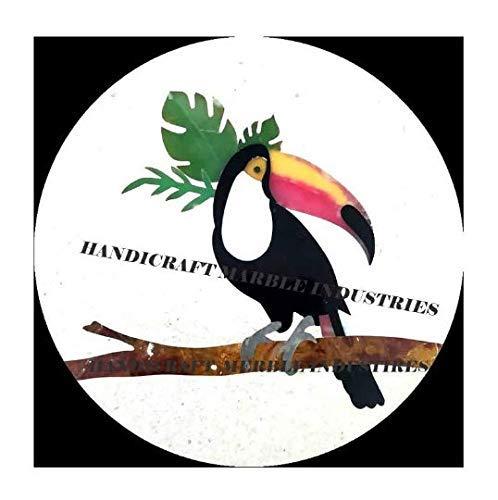This exquisite round table top offers a stunning combination of white marble with intricate Toco Toucan bird inlay using semi-precious stones like lapis lazuli, turquoise, and malachite. Measuring 18 inches in diameter, it serves as a unique centerpiece that adds sophistication and artistry to any indoor or outdoor space, be it your living room, dining area, or patio. The craftsmanship involved in creating this piece exemplifies meticulous attention to detail, making it a conversation starter and a symbol of travel and insight.