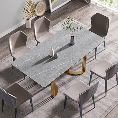 This elegantly crafted dining table is designed to resonate with contemporary living spaces. With dimensions of 78.74 x 29.92 x 39.37 inches, it strikes a perfect balance between spaciousness and comfort, making it an excellent choice for gatherings of various sizes. The combination of gold accents with a light marble top not only creates a luxurious aesthetic but also ensures durability and ease of maintenance. Its robust construction promises stability, allowing you to focus on enjoying your meals without worrying about the furniture’s integrity. The minimalist design and Scandinavian influence make it versatile for both casual and formal occasions, transcending trends and adding a timeless touch to your dining room.